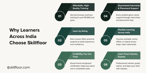 That’s why Skillfloor emphasizes “learning by doing”. Every course is designed to give you hands-on exposure, so you’re not just prepared for exams — you’re prepared for real jobs.