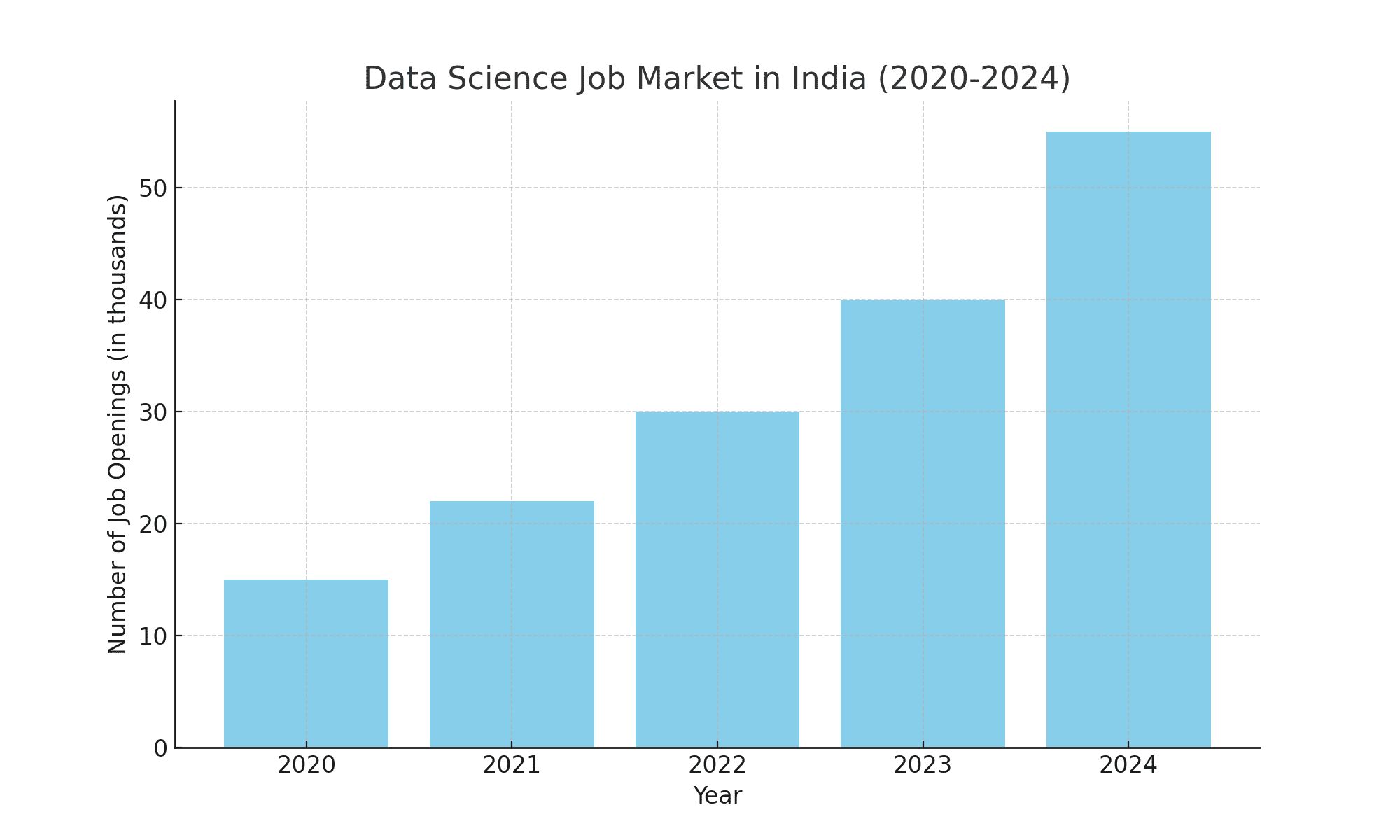 Growing Job Opportunities: In India, data science is growing. Entry-level positions are in high demand as organizations of all sizes, from startups to multinational corporations, require freshers to analyze data, generate insights, and assist in making informed decisions.
